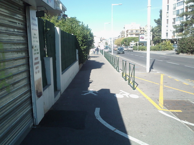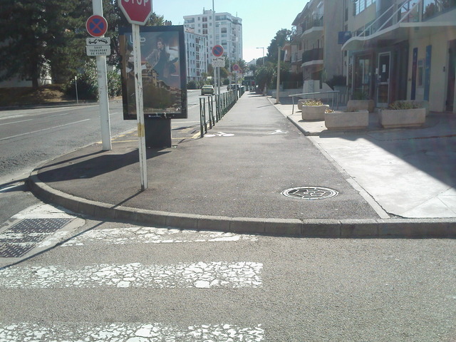 Cette bande qui se terminait jusqu’à lors au niveau de l’avant dernier feu, un peu après l’entrée de l’université et la poste, a été prolongée, toujours sur le trottoir et pour les 2 sens, vers le bas (la fin) de l’avenue (au croisement avec les avenues des maréchaux Juin et Koenig).