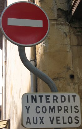 – du côté vélo, panneau sens interdit + panonceau «Sauf cycles»