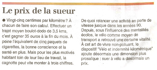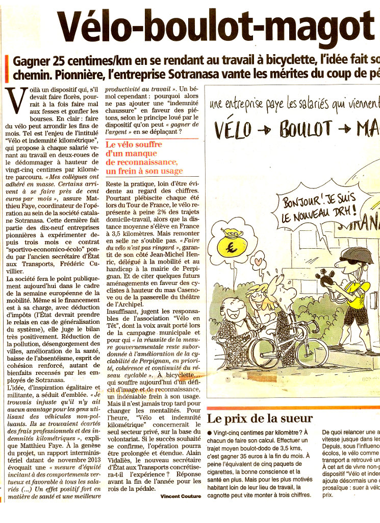 Vous pouvez voir ci-contre l’article de l’Indépendant, paru le matin même de la conférence de presse. L’article présente l’affaire comme une carotte donnée aux cyclistes pour qu’ils roulent plus et se fassent de l’argent, tout en faisant de la place aux voitures sur la chaussée. L’indemnité kilométrique pour les voitures, permettant un abattement d’impôt, est proportionnelle à la puissance fiscale (bien que plafonnée à 7CV depuis 2013), et elle est supérieure aux coûts kilométrique d’usage et donc clairement incitative aux déplacements motorisés. A-t-on vu un article titrant « auto-boulot-magot » pour autant ? Non. L’idée est juste d’être plus juste, de rétablir l’équilibre depuis trop longtemps laissé tel quel. D’ailleurs, si en France cela relève de l’expérimental et de l’innovation, d’autres pays européens l’ont mis en place depuis longtemps à des tarifs variables : 21c€/km pour la Belgique depuis 1997, 19c€/km pour les Pays Bas depuis 1995, 24c€/km pour l’Autriche puis 47c€/Km au delà de 6 Km, 15 c€/Km au Royaume-Uni,… Et les cyclistes ne seront pas les seuls à s’en mettre plein les poches, puisque l’étude du Ministère prévoit 570 M€ par an d’économie (santé, environnement,…) contre 170 M€ par an de coûts de cette mesure.