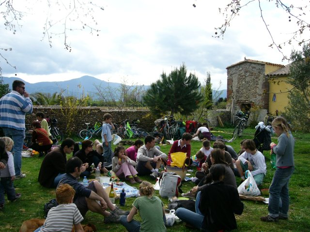 La visite au poulailler, les chiens, les jeux de ballons agrémentent le repos des enfants. Mais l’après-midi arrive et le soleil disparaît. Nous enfourchons alors nos montures pour le retour. La tramontane a la bonne idée de s’arrêter, nous facilitant ainsi la progression. Nous ne prenons pas le même trajet et varions un peu notre chemin. Nous n’avons pas de canaux, mais des agouilles dont les chemins de »halage » ne sont pas toujours carrossables ! d’où crevaison, chaîne sautée…mais nous savons attendre les retardataires. Nous arrivons sur Alenya, puis directement à Cabestany et revenons au point de départ vers les 17h, après une belle journée sportive et quelque 40 kilomètres de tours de roues. Nous tenons à remercier Thibaut et Claude qui ont « reconnu » les chemins ainsi qu’ Armelle qui nous a si gentiment reçu chez elle.