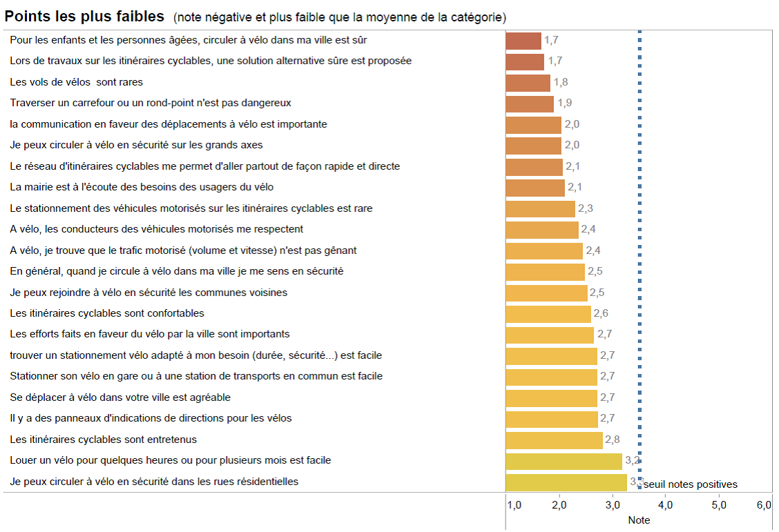 Nous vous avions sollicité pour répondre au baromètre des villes cyclables organisé par notre fédération nationale, la FUB. Au niveau national, 113 000 cyclistes ont participé à l’enquête, la première du genre qui se renouvellera tous les deux ans (résultats nationaux sous https://www.parlons-velo.fr/).