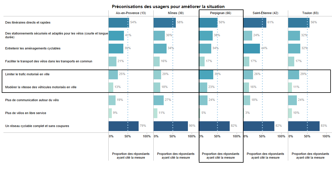 Du côté des préconisations (sur réponses fermées), on remarque que si la notion de réseau cyclable est plébiscitée partout, ainsi qu’une meilleure offre de stationnement et un meilleur entretien, les enjeux de limitation du trafic motorisé et de modération de la vitesse des voitures sont plus cités sur Perpignan que sur d’autres villes de taille similaire du sud de la France.