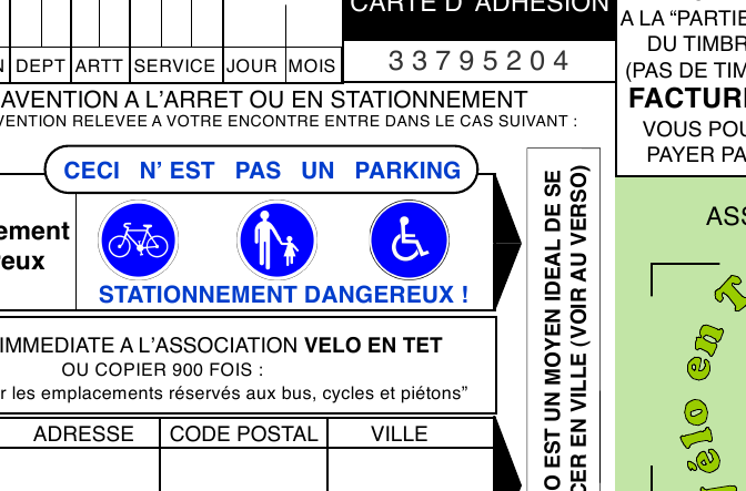 Vélo En Têt a imprimé en grand nombre un joli PV qui imite à s’y méprendre celui de la Police, et qui devrait punir de quelques secondes d’inquiétude les automobilistes qu’on laisse si facilement occuper pour leur stationnement des aménagements réservés à la circulation des modes alternatifs à la voiture : trottoirs, bandes et pistes cyclables, couloirs de bus… L’infraction se paiera donc par quelques minutes de lecture de notre document qui rappelle le risque que ce stationnement fait courir aux autres usagers (piétons âgés, poussettes, aveugles, cycliste…) et incite à utiliser une mobilité plus efficace que la voiture en ville (Transports en commun, marche, vélo). Nous avons souvent rappelé que ce stationnement sauvage devrait être sanctionné comme il se doit par un vrai PV ou, au minimum, par quelques remontrances des policiers. Mais nous échouons à obtenir cela à Perpignan. La journée sans voiture désignait sans doute trop clairement le mode de transport responsable de toutes les nuisances en ville : bouchons, pollution, occupation de tant d’espace, insécurité, bruit, etc… et la volonté politique de libérer la ville de l’omniprésence de la voiture en ville se fait ici attendre… Le stationnement sur les trottoirs est même à certains endroits encouragé par la présence de trottoirs surbaissés, voire de panneau « Stationnement sur trottoirs ». N’y a-t-il pas un paradoxe à affirmer vouloir favoriser les changements d’habitudes de nos concitoyens, et de continuer à tolérer ce stationnement sauvage. Vélo En Têt met fin à ce paradoxe et donne l’exemple en distribuant ces faux «PV». Puisse la police municipale nous suivre, et dans quelques mois, en distribuer de vrais ! Un membre de l’Union Catalane des Aveugles nous a fait parvenir, le Samedi 3 octobre, jour du lancement de cette opération, ce communiqué : Dans le prolongement de la semaine de la mobilité, les aveugles et malvoyants des PO souhaitent attirer l’attention des décideurs et des fonctionnaires territoriaux en charge des aménagements urbains sur les difficultés rencontrées par les aveugles lors d’un parcours urbain. Les trottoirs exigus sont encombrés par le mobilier urbain, par les plots ou par les véhicules en stationnement illégal. L’aveugle accompagné n’a souvent pas d’autre choix que de se séparer de son accompagnateur ou de descendre sur la chaussée pour éviter ces obstacles. Nous souhaiterions, en tant que citoyens et usager de la ville, que des parcours sécurisés et continus soient aménagés, que les centres ville et les quartiers se piétonnisent ou soient traités en « zone de rencontre », que les franchissement de ronds-points ou de rocades soient aménagés (faute de l’avoir été au départ), que la construction de trottoirs soient prévus dans les zones commerciales ou en voie d’urbanisation comme Mas Balande, Zone commerciale Nord et Sud etc. Les efforts et les réalisations pour faciliter l’accessibilité consentis par les communes n’auraient pas de sens si la mobilité des personnes handicapées n’était pas améliorée et rendue plus facile dans la ville. Nous soutenons donc l’initiative de nos amis cyclistes dans leur action de sensibilisation des automobilistes sur la gène créée par le stationnement abusif. -*** Ce communiqué intelligent a donc été diffusé par Vélo en Têt. Mais il a, hélas, valu à son auteur, Jean-Pierre Viala, une exclusion de l’UCA. Voir dans le forum ci-dessous le démenti de Henri Dumas, le Président de l’UCA, et la réponse de J.-P. Viala.