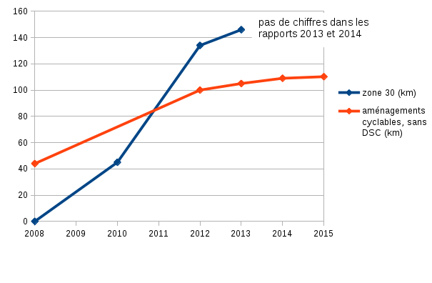 1,2 km de pistes cyclables en plus contre 5 en 2013 et 4 en 2014 ! Et aucun engagement chiffré pour les zones 30 dont les double-sens cyclables (DSC) constituent la majeure partie des aménagements pour cyclistes ! Pour mieux apprécier ces annonces, regardons ce qui a été réalisé ces dernières années, en prenant comme source les éditions précédentes de ce rapport (total des km de voirie aménagés):