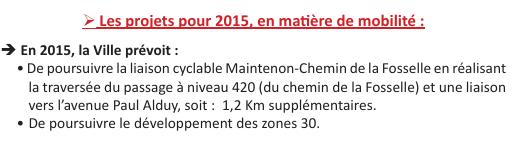 Dans le Rapport 2014 sur la situation en matière de développement durable de la ville de Perpignan, on trouve en page 28 les projets en matière de mobilité pour 2015 :