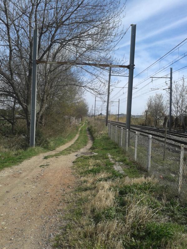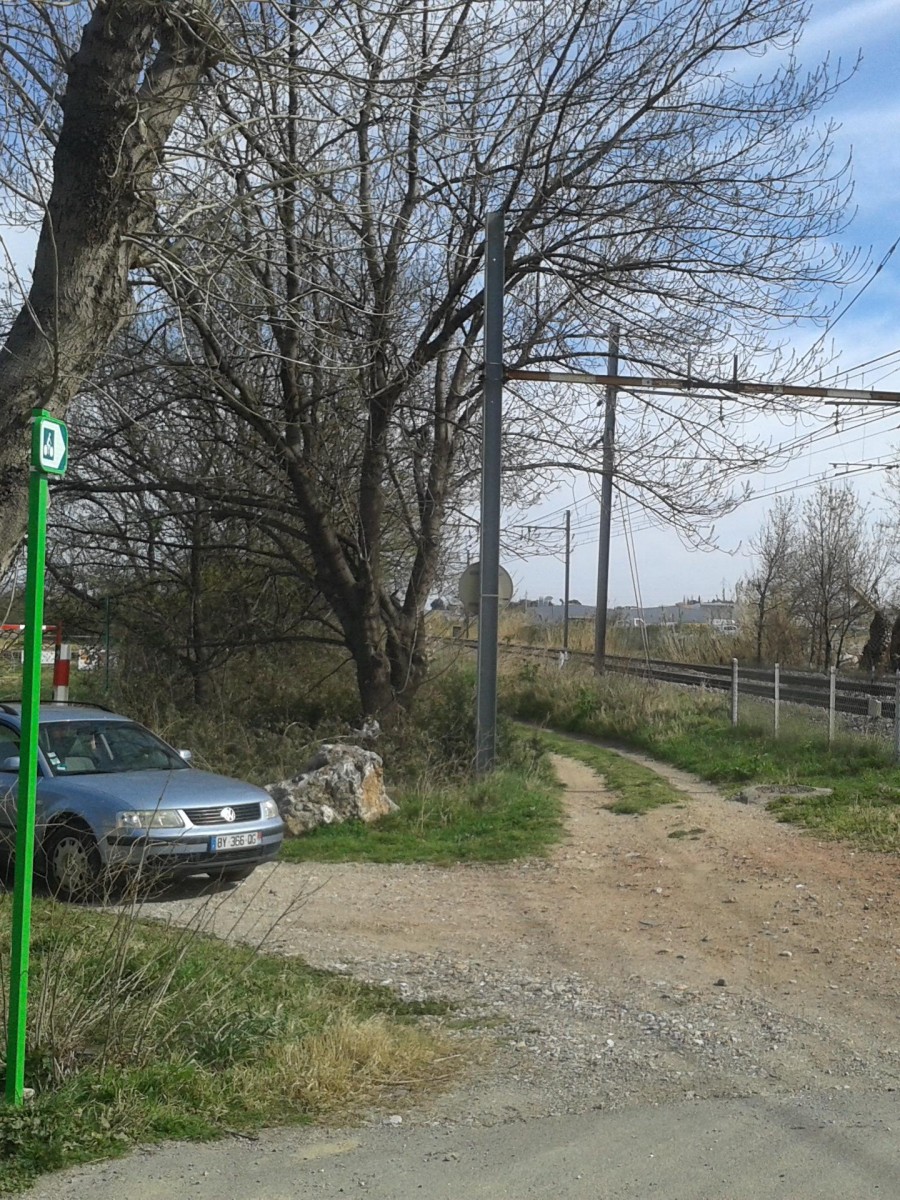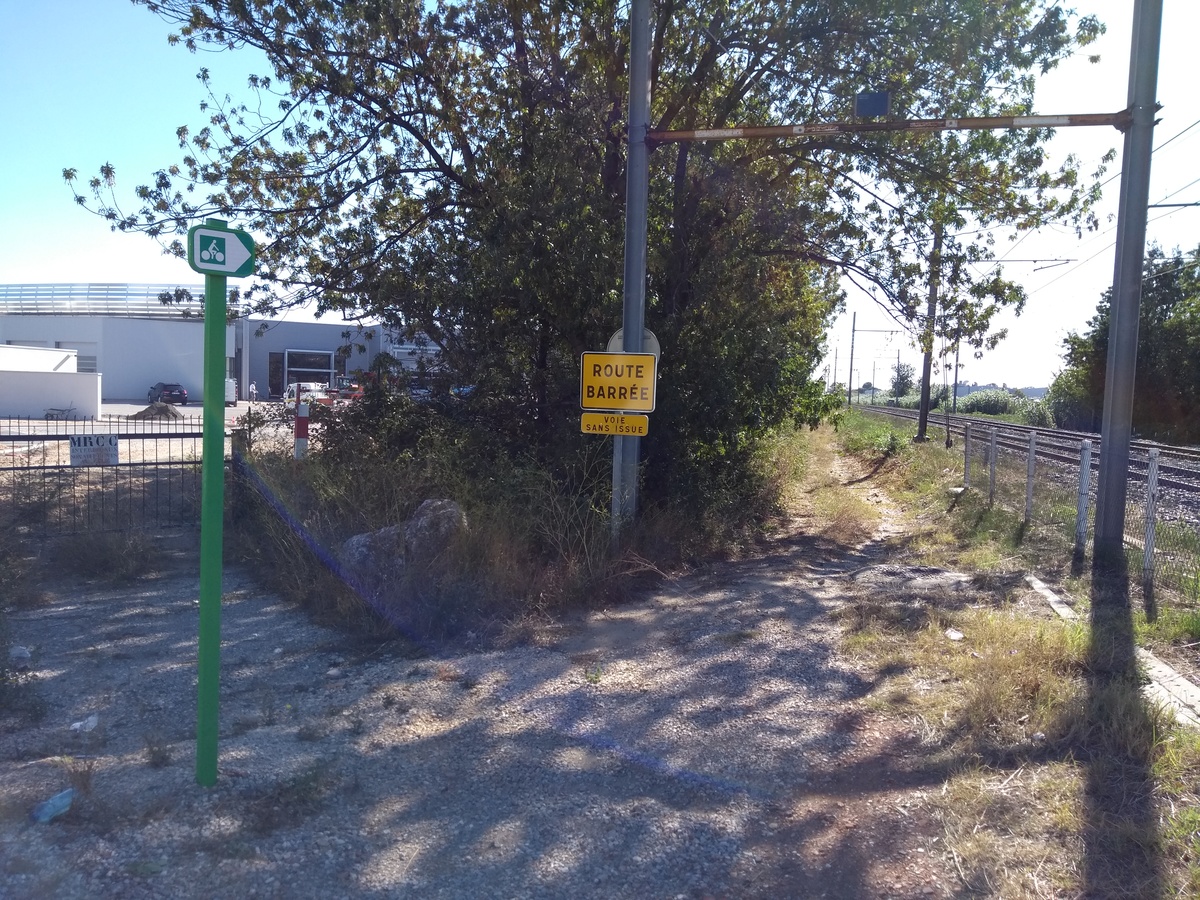 Ici, la ville de Perpignan prévoit de réaliser une piste cyclable qui reliera le chemin de Passio Vella à l’avenue Paul Alduy le long de la ligne de chemin de fer. En attendant on a déjà posé un panneau qui vous dirige pour l’instant sur un chemin impraticable avec un vélo en ville.