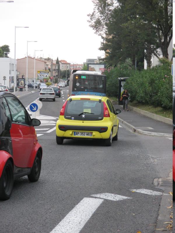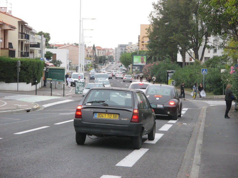 Lorsqu’on aborde la dernière section de l’avenue Paul Alduy, en descente du feu rouge vers l’avenue Koenig, la bande qui démarre au feu s’arrête avant le passage piéton en bas de pente. Le rétrécissement de la voie au niveau du passage piéton fait qu’on ait pris en tenaille entre aménagements et voitures, à un moment où est se déplace à peu près à la même vitesse que les voitures : qui laisse la priorité si on arrive en même temps au rétrécissement ??? (étant entendu qu’on ne descend pas, comme on nous le propose, sur le trottoir de gauche (!) en slalomant entre piétons, vélos qui montent et étals de légumes !).