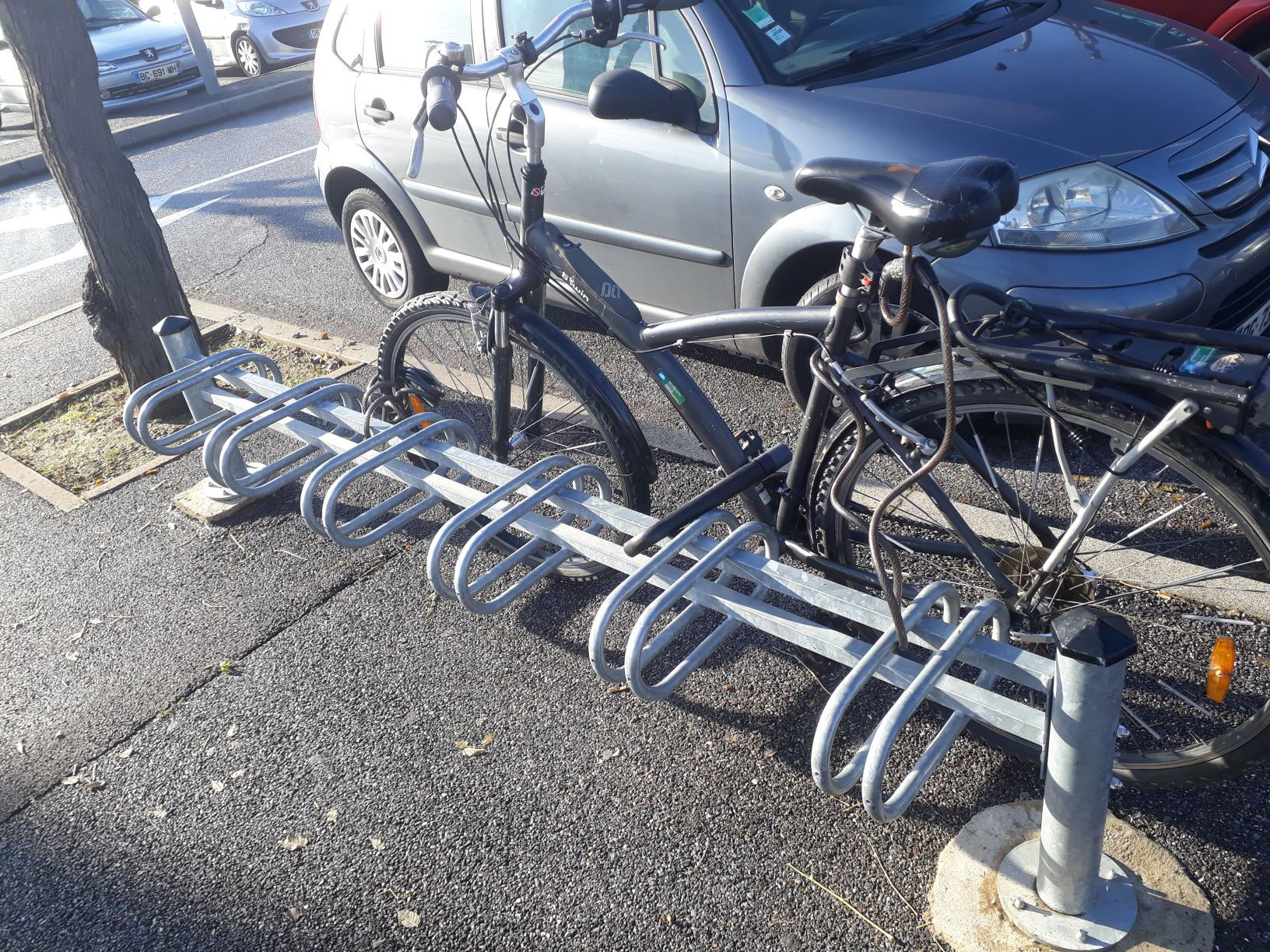 L’équipement pour stationner les vélos est inadapté : on ne peut accrocher que la roue avant si on l’utilise comme prévu. Or, c’est le cadre qu’il faut attacher.
