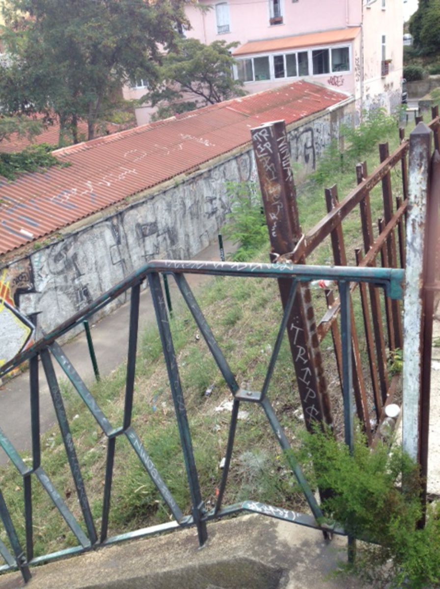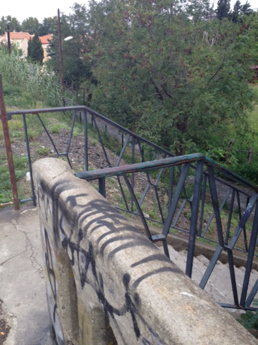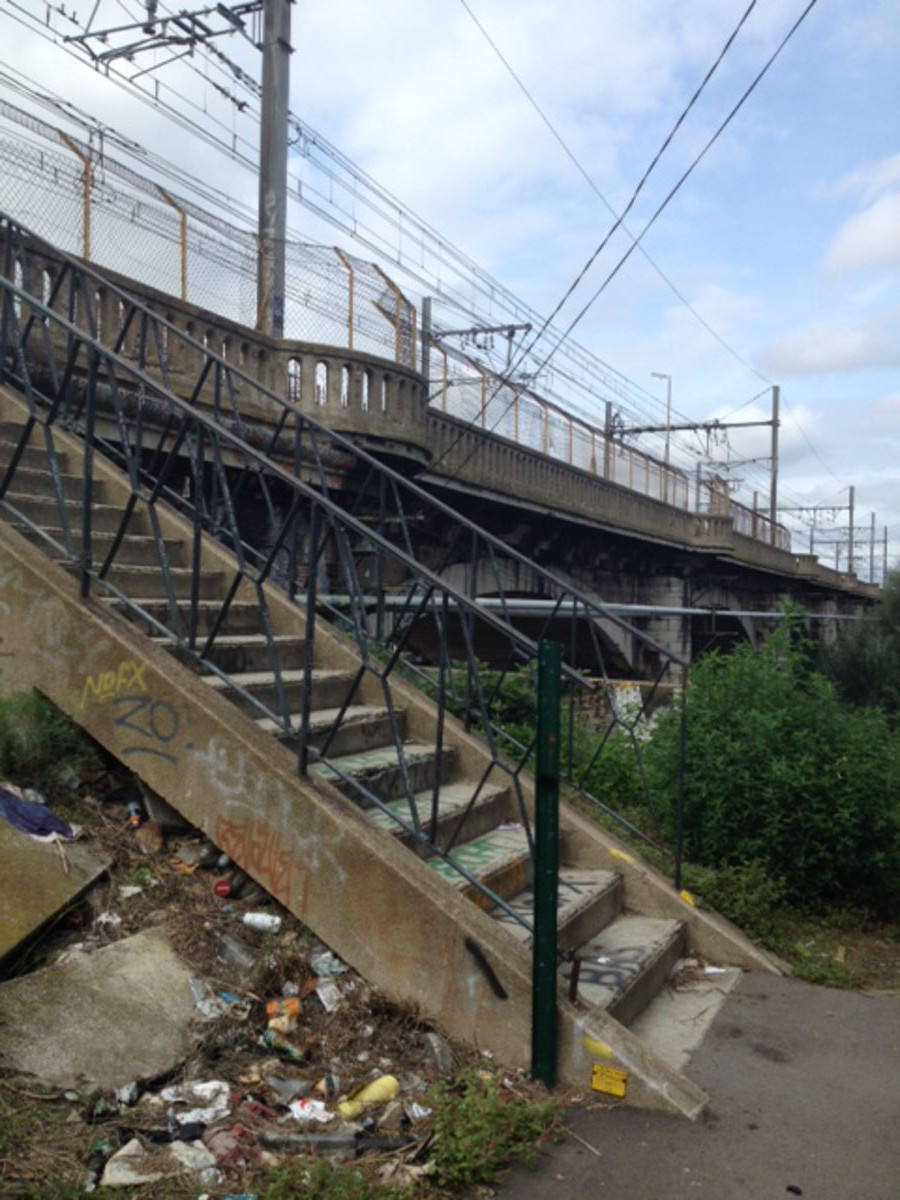 Le pont du chemin de fer est très utile pour les cyclistes mais plus d’un est rebuté par la montée un peu raide de ces 30 marches en portant son vélo. Pourtant la place existe (voir photos) pour faire un plan incliné. Ou au moins une goulotte pour pousser plutôt que porter le vélo.