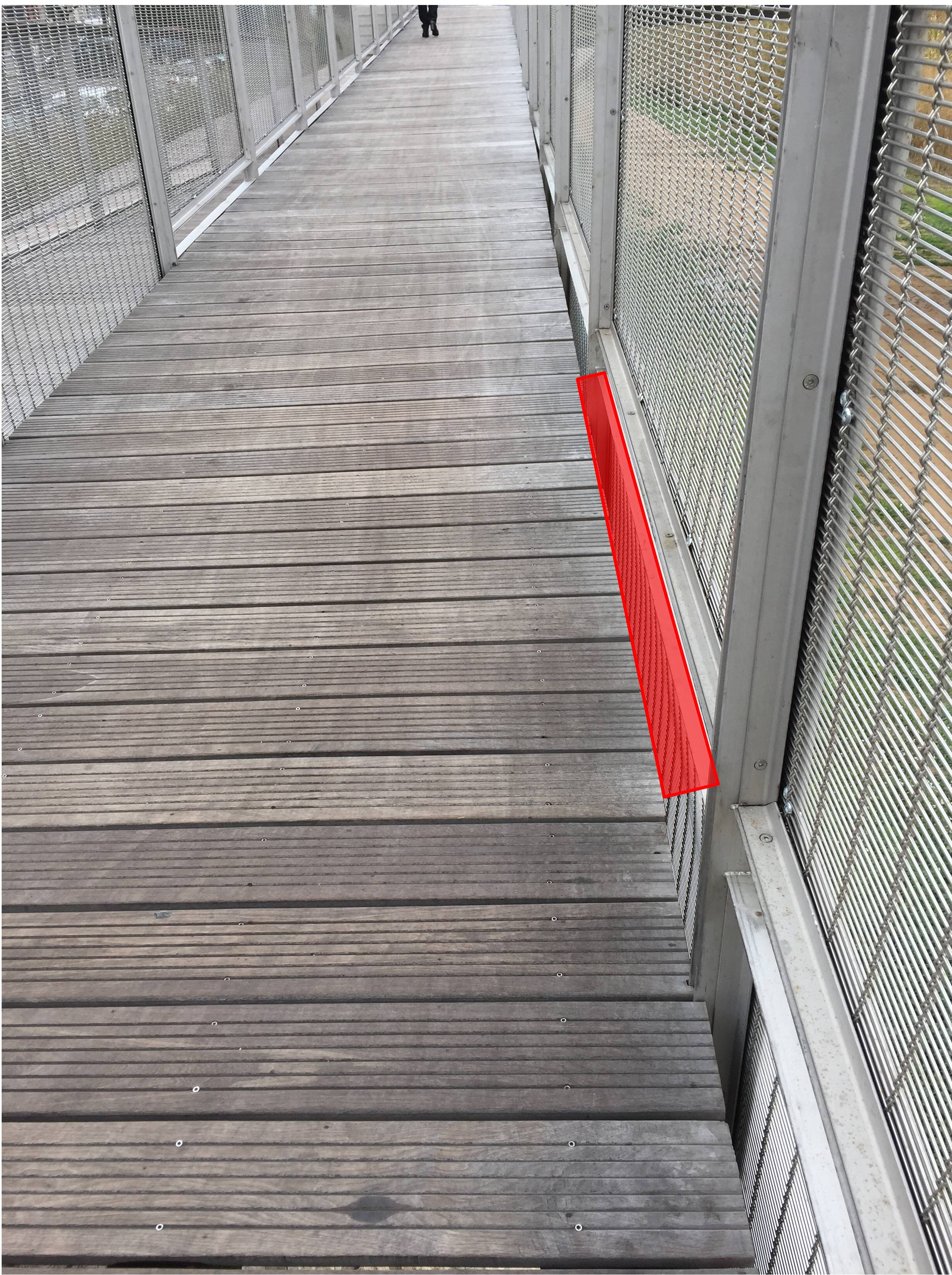 Au niveau de la rampe d’accès à la passerelle sur la Têt, rive gauche, du côté de l’avenue Torcatis, l’espace entre le bord des planches et la rambarde métallique est assez grand pour laisser passer un pneu de vélo, ce qui bloque la roue d’un coup. Résultat, une chute de vélo sur un ouvrage pourtant prévu pour les cyclistes.