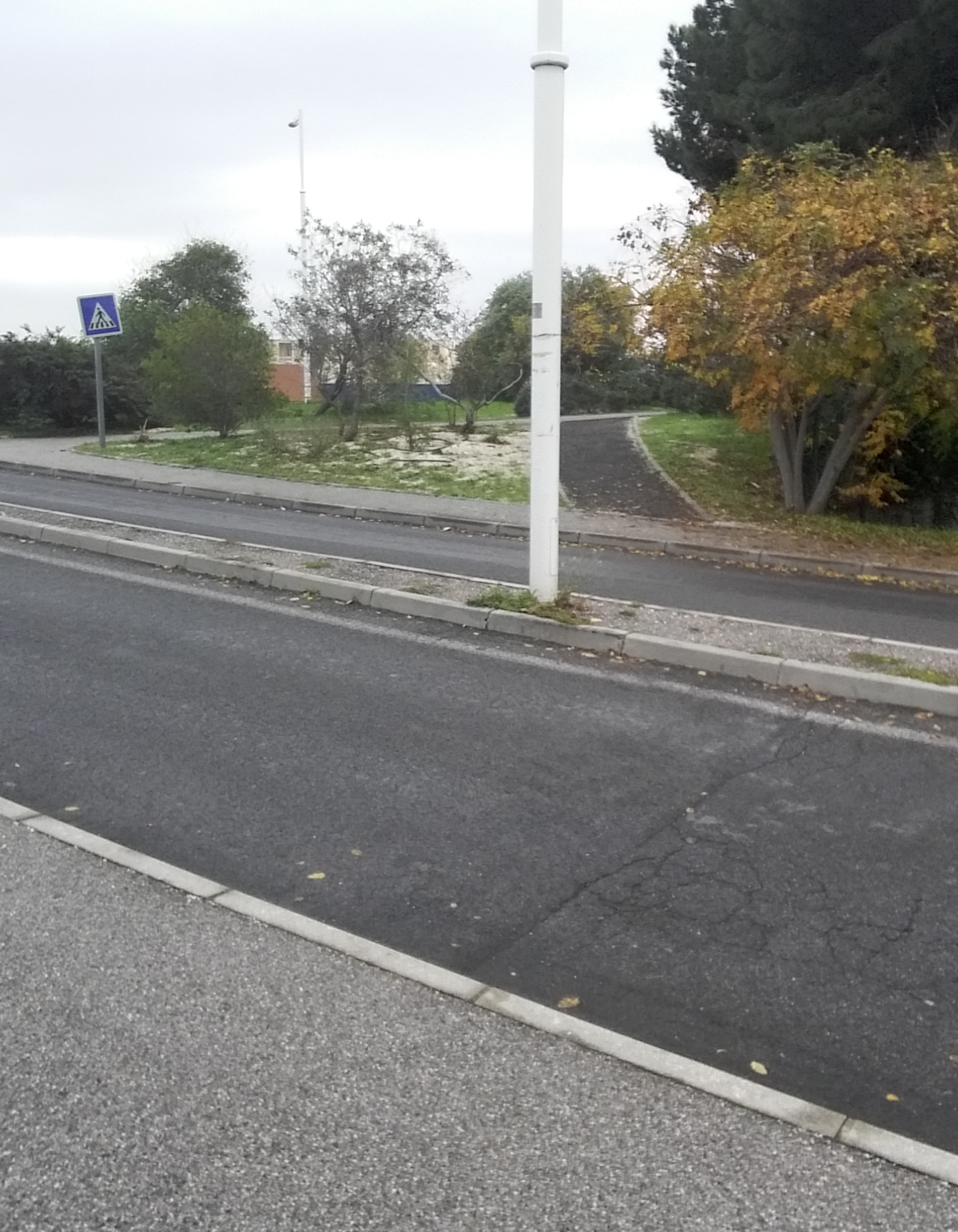 La traversée est néanmoins possible en poursuivant sur le trottoir vers le passage piéton idéalement situé en sortie de rond point sans visibilité en raison de la végétation. Les deux photos du passage piéton sont espacées d’environ une seconde. Cette végétation a été taillée depuis.