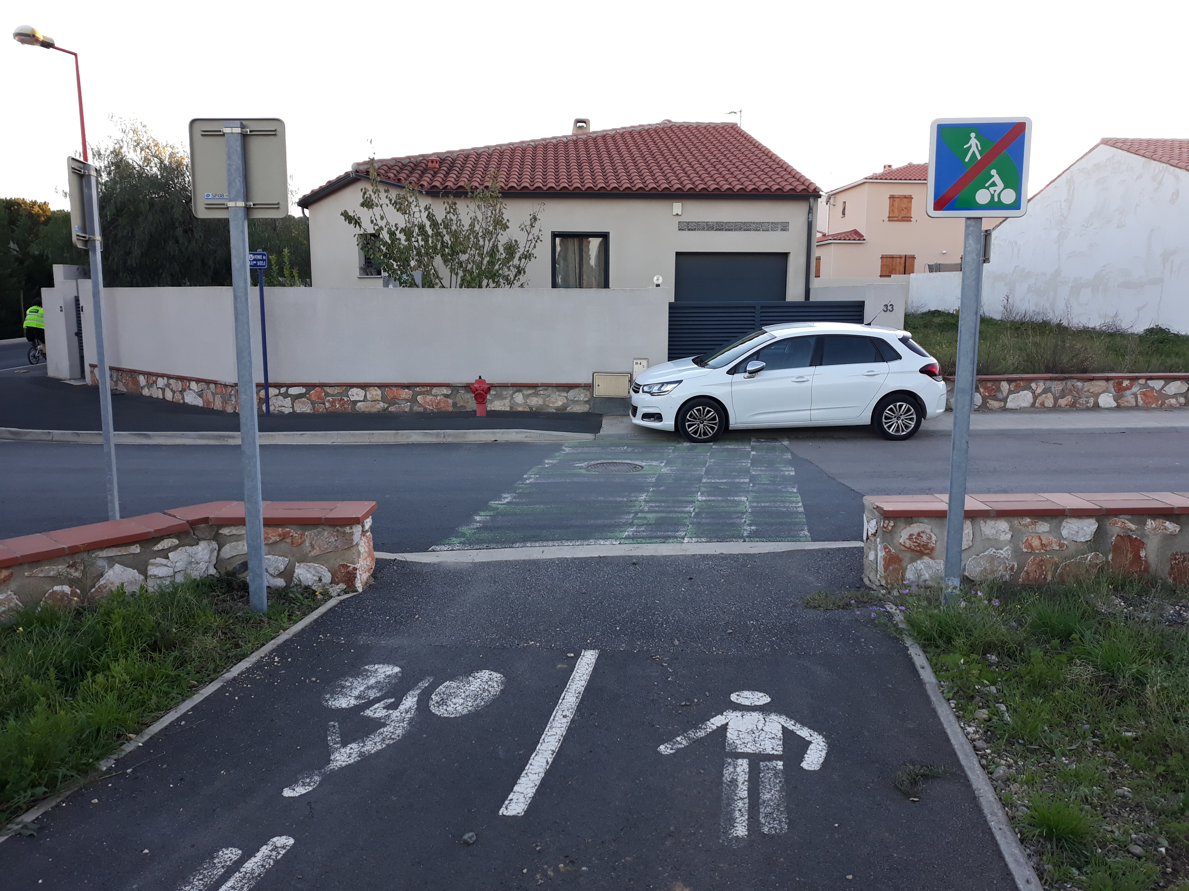 Sur cet aménagement qui devrait être une voie cyclable haut niveau de services entre un pôle de 10000 habitants et Perpignan. L’arrivée de la rampe terminant la voie cyclable longeant Clodion depuis Saint Estève. Il y eu une piste cyclable. Un ralentisseur (pour voitures) judicieusement placé à ce niveau permettrait de préserver cette continuité tout en ralentissant les véhicules depuis ou vers la cité Clodion. De plus, cela éviterait de taper sur des bateaux ou comme c’est le cas actuellement, sur l’absence de bateaux.